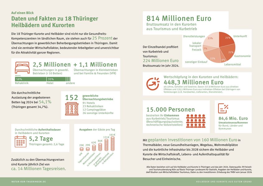 Die Kurorte und Heilbäder generieren mit 2,5 Millionen Übernachtungen pro Jahr ein Viertel aller touristischen Übernachtungen im Freistaat. Die durchschnittliche Aufenthaltsdauer liegt bei 5,2 Tagen – das ist in etwa das Doppelte des Thüringen-Durchschnitts. Gewinnbringend sind zudem die Ausgaben der 14 Millionen Tagesgäste in den Gesundheitsorten.