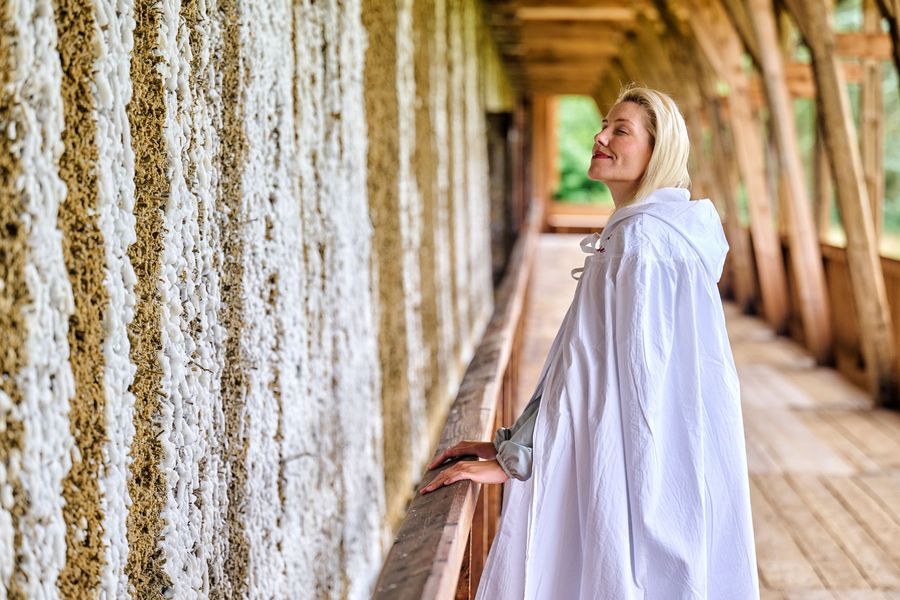 Weiße Kutten wie Ordensgewänder tragen die Menschen, die mit meditativer Ruhe die langen Gänge entlangschreiten. Neben ihnen tröpfelt Wasser über eine Wand aus salzverkrusteten Schwarzdornzweigen. Es riecht nach Meer – mit leichten Noten von Erde und Holz. Gradierwerke, wie in Bad Salzungen, dienten ursprünglich der Salzgewinnung. Schon seit dem 19. Jahrhundert werden die Einrichtungen auch für Therapie und Prophylaxe genutzt. „In der kühlen, klaren und an den Reisigwänden leicht befeuchteten Winterluft breiten sich die salzhaltigen Aerosole gleichmäßig aus“, erklärt Nancy Bojens von der Solewelt Bad Salzungen. Die mineraliengetränkte Luft befeuchtet die Schleimhäute und regt die Durchblutung an. Verstärkt wird dieser Effekt bei Wechselanwendungen zwischen Freiluft-, Brunnenhallen- und Rauminhalationen, wie sie in Bad Salzungen ganzjährig möglich sind.