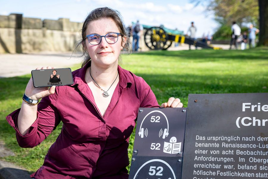 Neben Menschen im Rollstuhl, mit kognitiven Beeinträchtigungen oder einer Sehbehinderung widmet sich die Bergfestung beim Thema Barrierefreiheit noch einer weiteren Zielgruppe: den Gehörlosen und Schwerhörigen. Sie sind auf die Deutsche Gebärdensprache, die Informationen über Hand- und Mundbewegungen, Mimik und Körperhaltung vermittelt, angewiesen. Etwa 200.000 Menschen nutzen die DGS in Deutschland. Für sie entwickelte die Festung einen Videoguide, bei dem ein Gebärdendolmetscher an zwölf Stationen Festungsgeschichte erklärt.