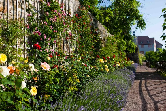 Ein Pilgerziel für Rosenfans ist das Ensemble Dornburger Schlösser mit ihren Schlossgärten. Mehr als 2.000 Rosenstöcke sorgen für duftige Blütenpracht in den fünf teils im englischen, teils im französischen Stil gestalteten Terrassengärten. Highlight für Augen und Nase ist der von Kletterrosen umrankte Laubengang. Bei einem Volksfest Ende Juni wird jährlich die Dornburger Rosenkönigin gekrönt.
